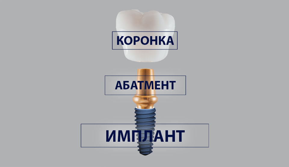 Имплант состоит из 3 компонентов: тела имплантата, абатмента и коронки.